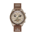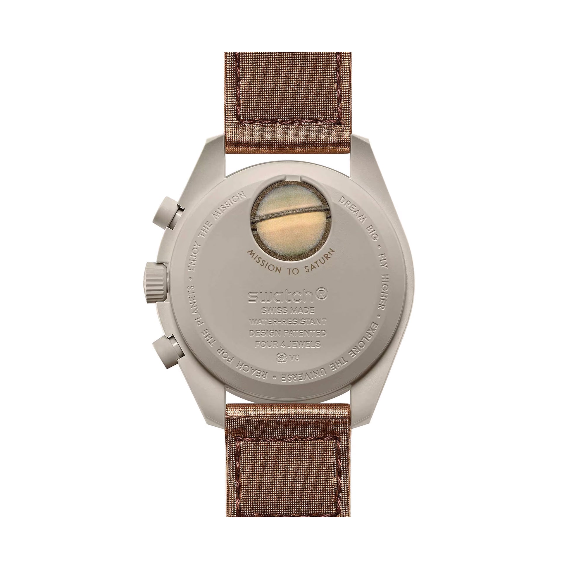 De Swatch x Omega Bioceramic Moonswatch Mission to Saturn (SO33T10) ha un quadrante marrone e un cinturino in velcro, che crea un contrasto con le tonalità sabbia e beige. L'orologio ha una caratteristica extra rispetto ad altri modelli della collaborazione: gli anelli di Saturno sui quadranti dei secondi. La Swatch x Omega Mission to Saturn (SO33T10) ha un movimento al quarzo, è resistente a 3 bar di pressione dell'acqua e mostra i dettagli iconici del Moonswatch originale di Omega.