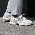 New balance 9060 Moonbeam Sea Salt é um silhueta futurista da New Balance, que oferece uma mistura de sofisticação e conforto. O design apresenta uma base em mesh branca, complementada com sobreposições em camurça creme e couro cinzento para um aspeto elegante.